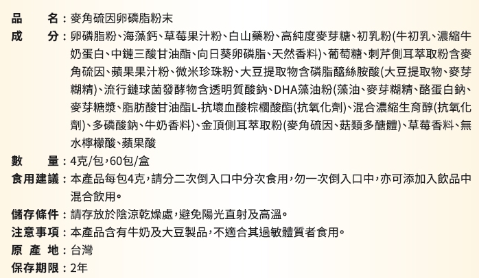 3.過敏原 : 本產品含有牛奶及大豆製品,不適合其過敏體質者食用。