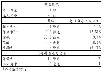 成分 : 印加花生油、亞麻仁油、金盞花萃取油(20%葉黃素)、黑豆皮萃取物(黑豆皮萃取物、麥芽糊精)、金盞花提取物含5%玉米黃素(金盞花提取物、玉米糊精)、冷壓木鱉果油、納豆萃取物(納豆蛋白酵素、麥芽糊精)、紅藻萃取物(蝦紅素)、山桑子萃取物(山桑子萃取物、麥芽糊精)、枸杞萃取物、專利綠蜂膠萃取粉(蜂膠液、環狀糊精)、預拌維生素(乳糖、本多酸鈣、維生素B12、維生素B1、葉酸、生物素)
