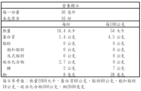 成分 : 水、果寡糖、膠原蛋白、黑棗濃縮汁、白葡萄濃縮汁、紅棗精粉(紅棗粉、氧化澱粉、麥芽糊精)、蘋果酸、川芎萃取物(川芎、玉米澱粉)、柑橘果膠、刺五加萃取物、枸杞萃取物(枸杞萃取物、麥芽糊精)、西洋蔘萃取物(西洋蔘、糊精)、香料、熟地萃取物(玉米澱粉、熟地、羧甲基纖維素鈉)、蔗糖素(甜味劑)、N-乙醯基-D葡萄糖胺、甘草萃(甜味劑)、珍珠粉、當歸濃縮粉(當歸、玉米澱粉)